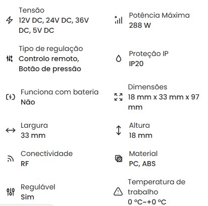 Quantidade de Controlador Regulador Fita LED Monocor 5/12/24/36V DC Compatível com Controlo Remoto RF e Pulsador