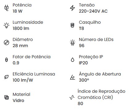 Tubo LED T8 G13 120 cm Vidro Conexão Uni-Lateral 18W 120lm/W 4000K